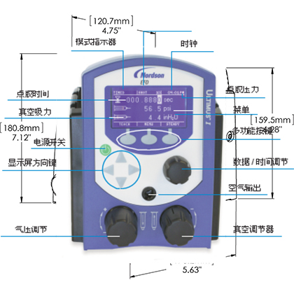 ? 所有的數字多功能顯示器能同時讀出氣壓、時間、真空、點膠注射計數和時間。